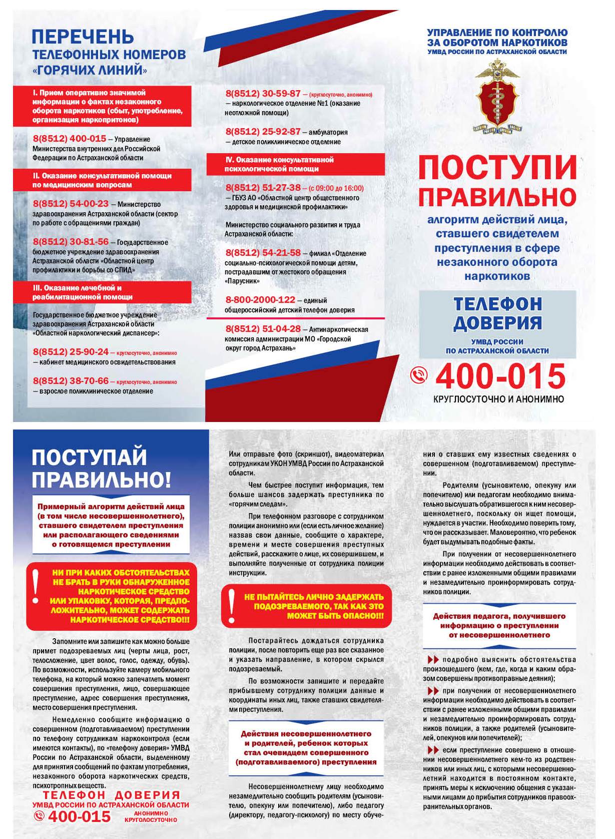 Позвонив по телефону выделенной линии Управления Министерства внутренних дел России по Астраханской области 40-00-15 Вы можете анонимно сообщить информацию о местах сбыта наркотиков, организации наркопритонов, о фактах пропаганды и распространения наркотиков через сеть Интернет, культивирования наркосодержащих растений
